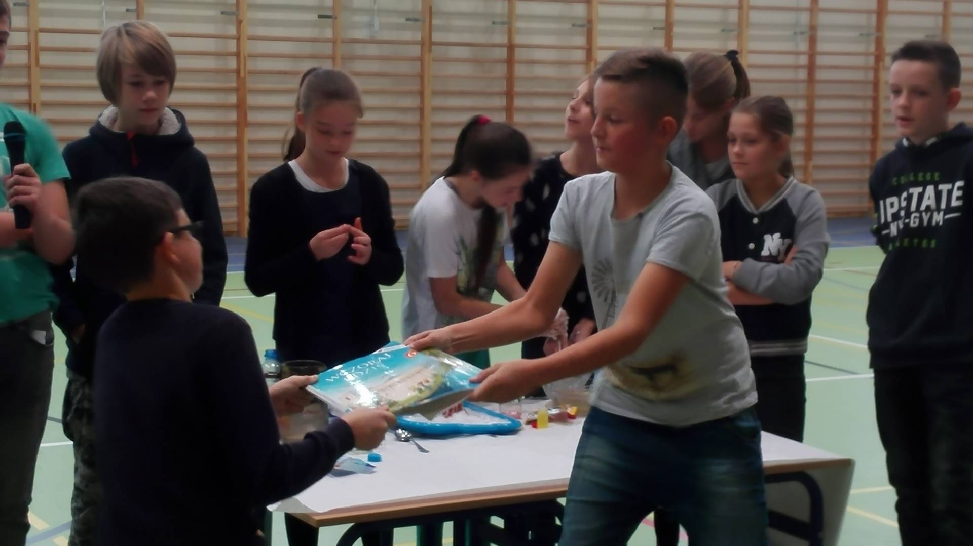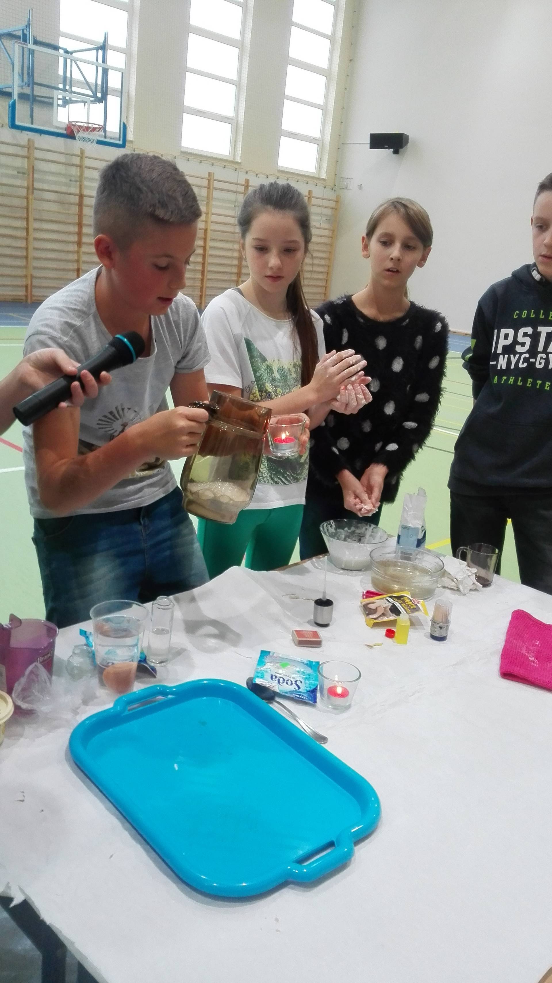 Przygotowali je szóstoklasiści pod kierunkiem p. Alicji Żmijewskiej. Pokaz z dużym zaciekawieniem obserwowali uczniowie klas młodszych. Starsi koledzy szczegółowo wyjaśniali, na czym polegają ich doświadczenia. Szczególnie podobał się publiczności wybuch wulkanu i eksperyment, w którym wieniec z balonów wirował unoszony ciepłym powietrzem z suszarki. Wiele emocji wzbudziła możliwość dotknięcia jajka, którego skorupka na skutek kilkugodzinnego leżenia w tajemniczym płynie stała się miękka i sprężysta. Aby włożyć palec do białej masy w szklanej misie ustawiła się długa kolejka. Wszyscy chcieli sprawdzić, dlaczego palec zanurza się w niej bez trudu do samego dna, a dłoń zwinięta w pięść nie jest w stanie przebić jej powierzchni.